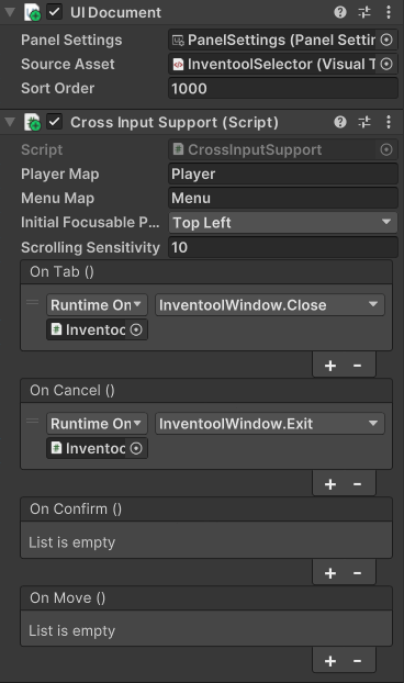 CrossInputSupportedWindow's in the scene. All of Inventool's UI Toolkit windows already inherit from this class.