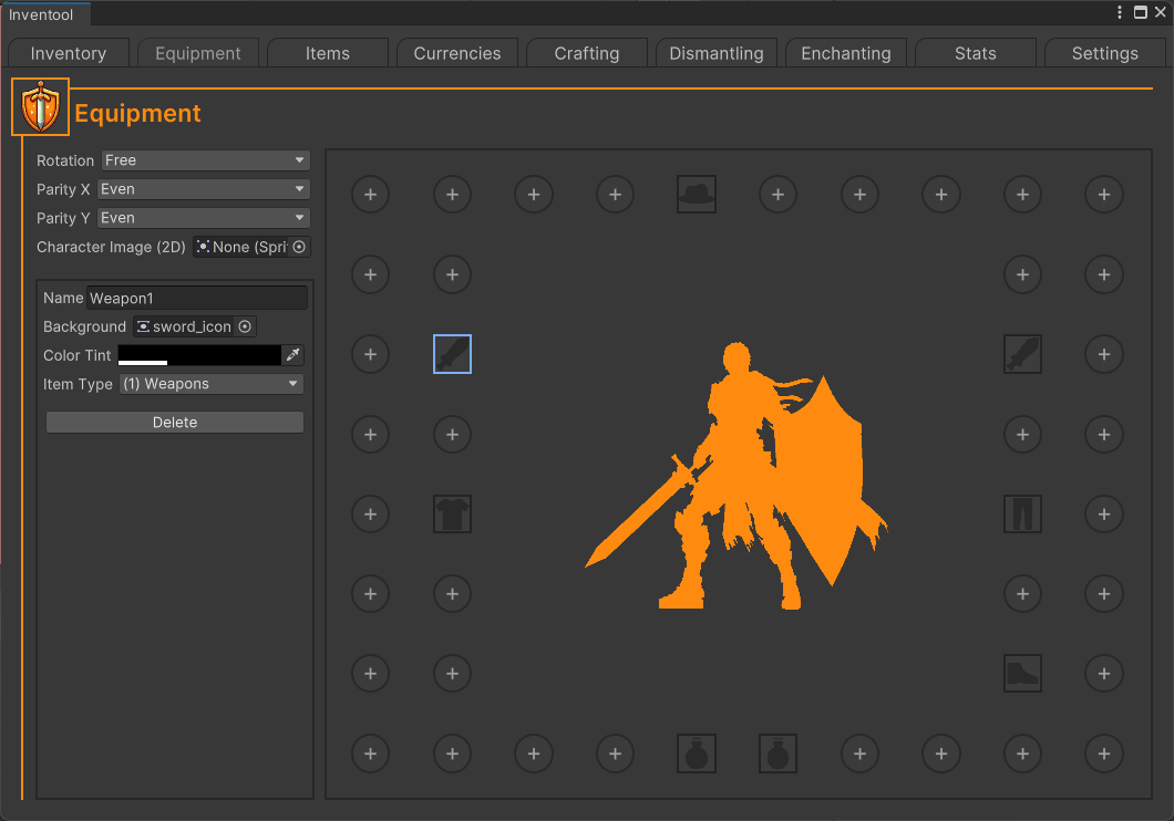 The equipment section allows you to create equipment item slots with item type restrictions. Click any plus button to add an item slot in that position. Item slots can be deleted from the left-hand side after they are selected.
